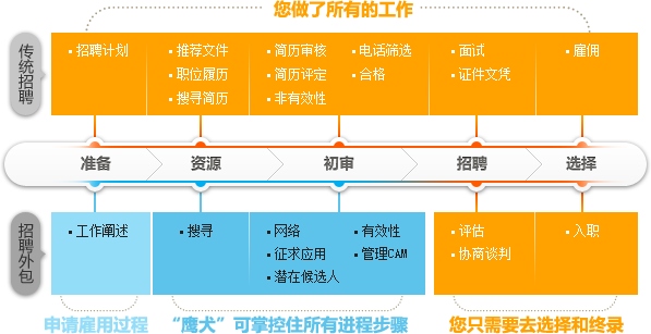 招聘外包服务定义:招聘服务外包是指企业将全部或部分的招聘活动外包给第三方专业服务商完成,是基于招聘流程管理系统的招聘流程外包。包括招聘需求确认、招聘广告发布、招聘渠道的选择、简历收集与筛选、测试/面试安排、测试/面试实施、背景调查、候选人评价与推荐、沟通与发送录用通知。